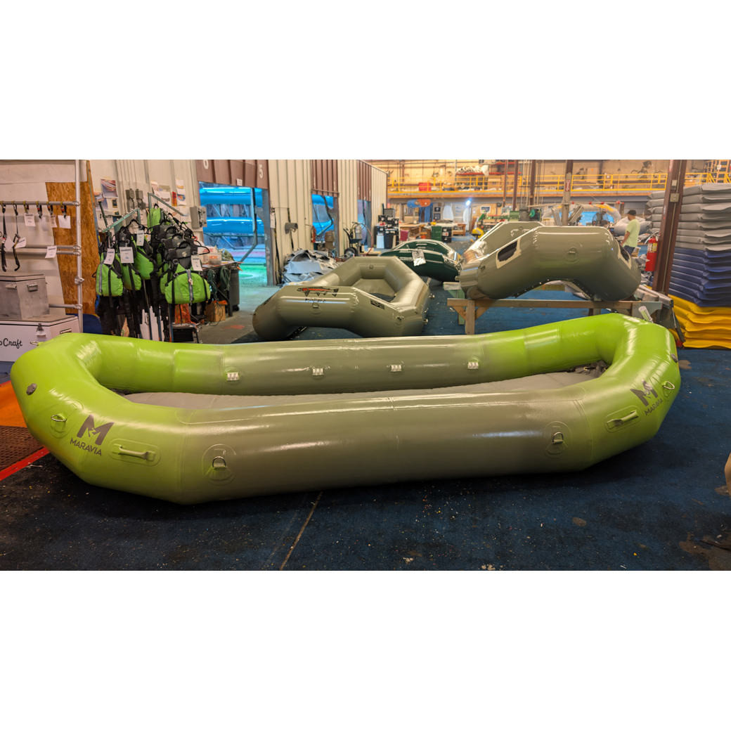 The sleek Maravia Zephyr is a larger version of the Diablo, or a diminishing tube version of the Williwaw 1.5.The tubes diminish in diameter from 21″ in the straight side sections down to 16″ in the bow and stern. This design provides more inside space for gear and people in the bow and stern, and is also an advantage when you encounter those upstream canyon winds in the afternoon.