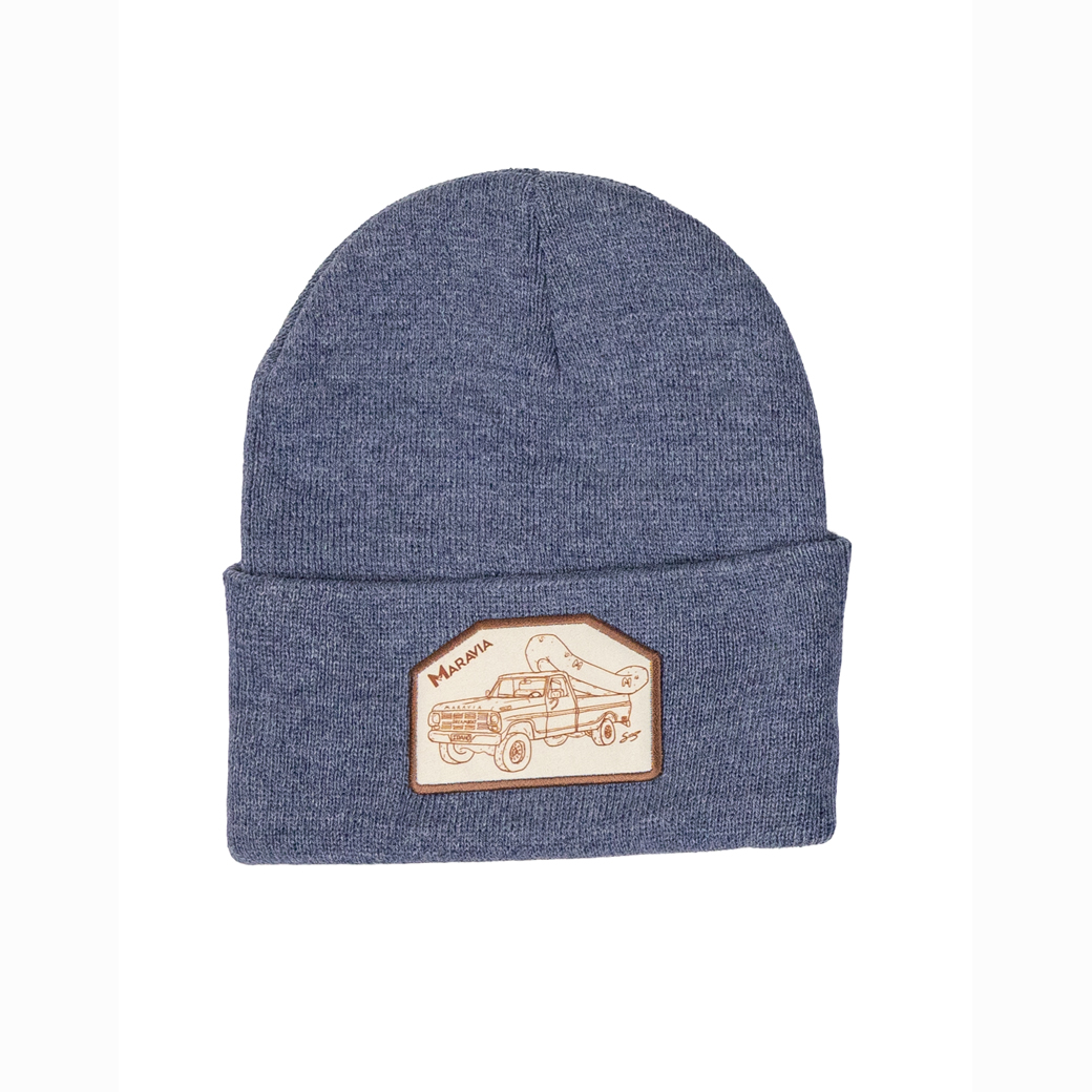 A classic knit beanie featuring a custom patch with the Maravia logo and a hand-sketched vintage truck hauling a raft. A tribute to early mornings, dusty shuttle roads, and the rigs that get us to the river. Warm, comfortable, and ready for life on and off the water.