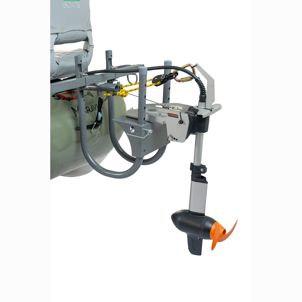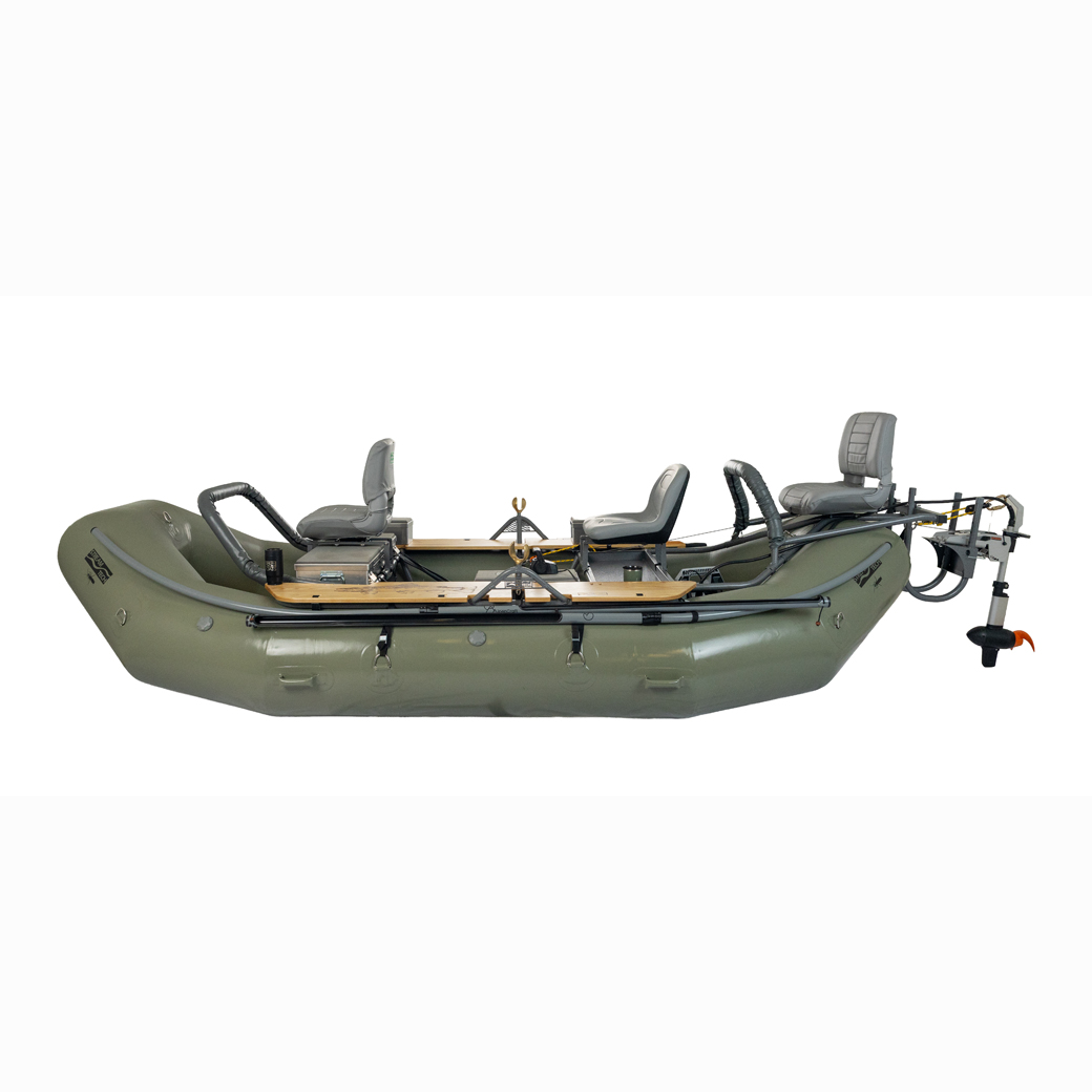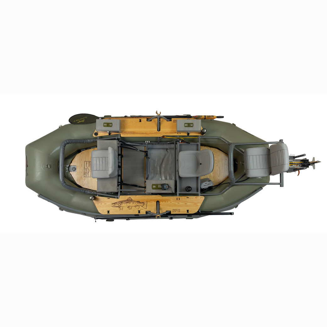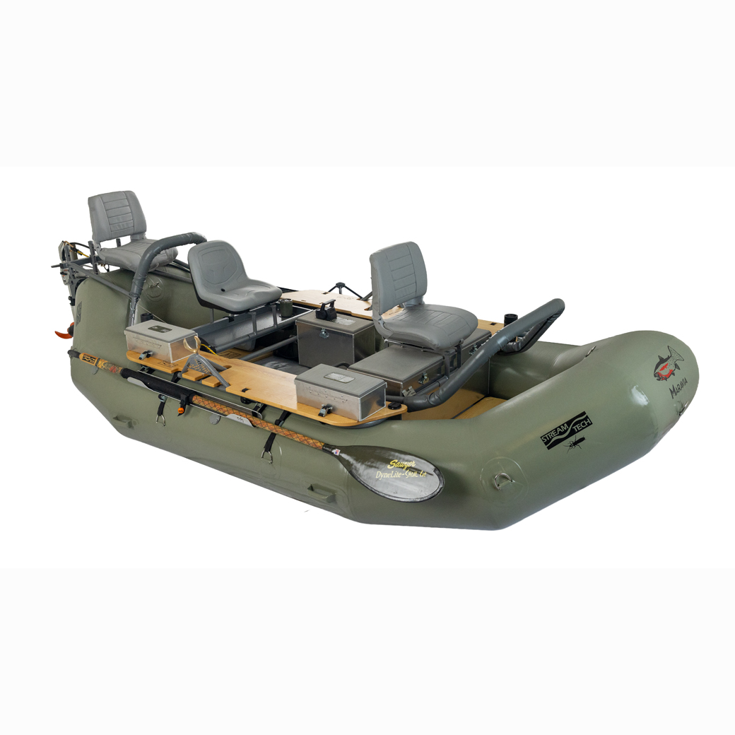 The Salmonfly is the best maneuvering drift boat on the market with a stable high floating design. Key features include a self-bailing, hard, flat “drop stitch” floor, with full length rocker, padded swivel seats and front and rear fishing positions, padded tractor seat and bracket for the oarsman, the Stream Tech anchor system, front and rear fisherman leaning stations, Sawyer Square Top oars, Cobra oarlocks, straps, hardware, pump and repair kit. 3 Gear Bay Frame capacity for boxes or coolers. Raft is built in the USA by Maravia using their tough, unique seamless urethane encapsulation technology. It is the perfect “quiver of one” boat that offers all the best fishing amenities, 3 bay expedition capable frame, tons of possible accessories and thwart option for extreme paddle rafting.